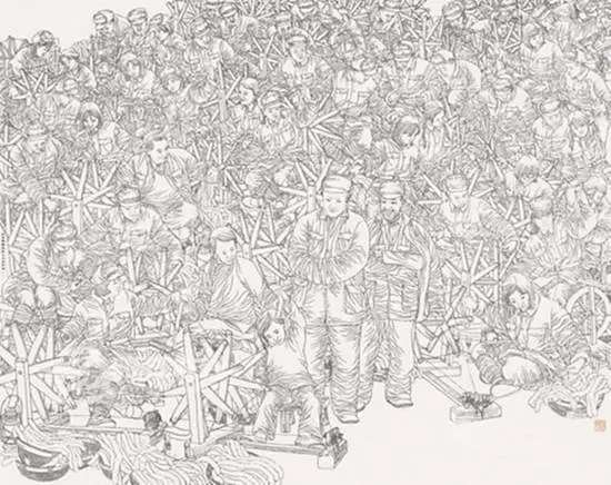 其源头来自于2007年,杨光利和王有政先生合作创作了国家众大历史题材作品《纺线线——延安大生产运动》。这幅历时四年的作品,从史料的搜集、人物的确立、现场的考察、人物造型的安排、确立主体稿到最后的完成,可以说是跌宕起伏。尤其面对领袖、士兵众多人物的纺织场景,用惯常的素描加水墨的手法去表现,几易其稿依然没找到理想效果。