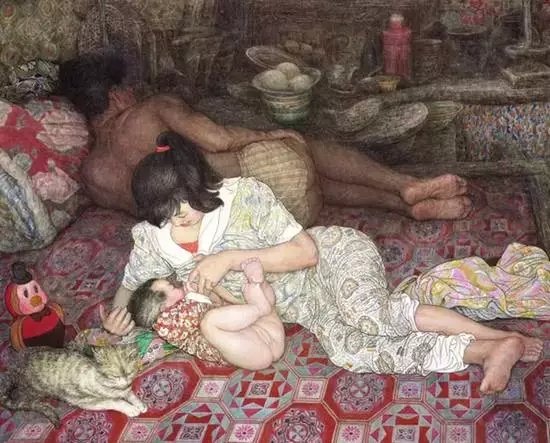 在经过早期的《晨读》和《喂》之后,我最大的收获是理解和领会了艺术技巧与生活关系。在此后的创作中,我从未松懈对作品表现能力的追求,反而要求自己在每一幅创作中不断浓缩对人物场景的感悟。但我知道,作为一个人物画家,人物的个性及其生动与否、画面大结构与纯朴、真实的气息和人情味,与表现技巧之间孰轻孰重的关系。我不太相信,只有小花小草才是美的,苍茫、浑厚与质朴、乃至生命的悲剧感就是不美的。我并不排斥小情小调,但在事实上,往往正是对小美浅俗的追求与笔墨上的玩闹,降低了当代文化的品格。