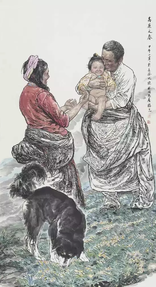 1984——1988年间,我创作了《月夜》、《沐浴》、《捡枣》这一系列相对平缓、轻松、抒情的作品,但真正心系与用力的还是《厚土》(1986——1988年)、《簸黑豆》(1987——1989年)几幅大画,并为此倾尽心血。一位友人认为前者犹如大制作之前的散文,后者则如长篇小说。它们寄托和承载着我内心的希望与期盼,厚重的黄土层不再以苦难压倒他们,他们也不再是穷苦岁月中偷生的生灵,而是以自己新生命的活力充斥大地。而在九十年代创作的《翰林马家》(1993)、《炕头》(1994)、《寒食》(1997)、《中国民工——石工》(1999)与新世纪创作的以青藏高原为题材的《朝圣者》(2000)、《美丽草原我的家》(2004)、《春回高原》(2011),我希望在探索前行中推进,逐步完善自己的艺术面貌,甚至期许在自己的绘画中建立一个更大、更具精神高度与生命力的高原。