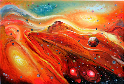 建南的画(如上图《起源》及下图《红红火火》)值过千万美元、上亿美元?是的,千真万确,估价者是美国大名鼎鼎的著名经纪人。这位名叫迈克.亨.德格兰(MichaelSeanDeg