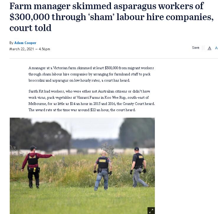 《时代报》22日报道,法院得知,2015年和2016年,基特(Sarith Kit)让非澳洲公民或没有工作签证的工人在位于墨尔本东南部Koo Wee Rup的Vizzarri农场包装蔬菜,时薪低至14元。法庭得知,当时的正常工资应是每小时22元左右。另外法庭还获悉,基特一边用现金作为发给工人的工资,一边通过农场的所有者——M&G Vizzarri公司,向V&T Golden和STN Seven这两家劳工雇佣公司支付款项,从中捞钱。检察官罗宾逊(Nicholas Robinson)称,这两家公司实际上是“虚假的劳务雇佣公司”。