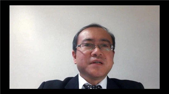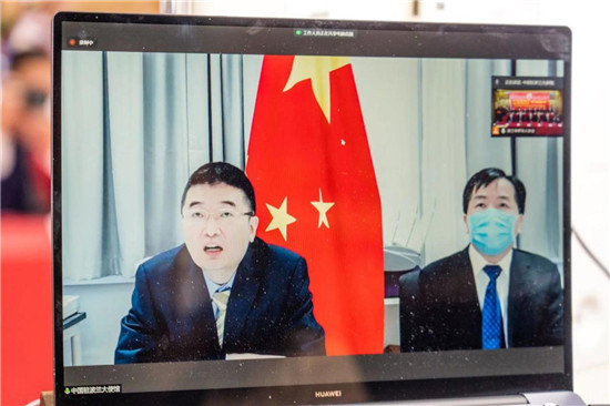 中国驻波兰大使馆赵洋参赞(左一)和领事部主任王占杰(右一)出席视频会议