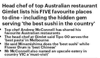 麦康内尔表示,墨尔本CBD的意大利餐厅Tipo OO有“最棒的意大利面”,Richmond地区的日料屋Minamishima提供“最棒的寿司”。