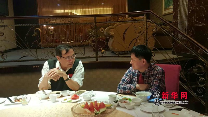 中国中宣部新闻出版局张凡副局长(左)同韩国执政党新国家党中央委员会中国同胞专门委员会委员长、韩国全国韩籍中国同胞总联合会总会长,韩国新华报业集团董事长、新华报社长曹明权(右)在亲切交谈。