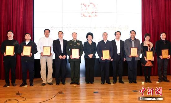 3月18日,国务院侨办2016年“文化中国·四海同春”工作总结大会在北京举行。国务院侨办主任裘援平向“文化中国·四海同春”参演艺术院团代表颁发纪念牌。 中新社记者 张勤 摄