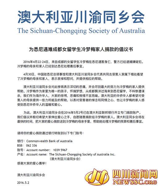 由澳大利亚川渝同乡会在今天发起的《为悉尼遇难成都女留学生冷梦梅家人捐款的倡议书》