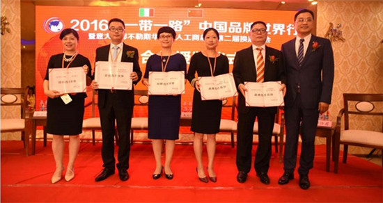 《欧华联合时报》吴敏社长给品牌企业代表颁发战略合作证书。(意大利欧华传媒网)