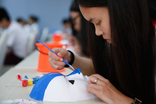 当日,2016中国寻根之旅魅力北京夏令营戏曲营的18名来自法国的华裔青少年在北京中国戏曲学院内学习绘制脸谱。通过学习京剧知识,这18名法籍华裔青少年在人脸模具上根据传统京剧脸谱的样式勾勒出自己创新的脸谱。据了解,2016中国寻根之旅魅力北京夏令营日前在北京开营,五大洲多个国家的350名华裔青年参加此次夏令营中国之旅。期间,夏令营分为武术营、书画营、舞蹈营和戏曲营,通过授课、实际体验、参观游览等方式,让海外华裔青年了解中国传统文化。