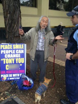 林丹尼一度每天现身悉尼东区的艾奇克里夫火车站(Edgecliff Station),并背标语,中文意为:“和平微笑。人皆可变。艾伯特(Tony Abbott,时任澳洲总理),你不能吗?”其中一单词字母颠倒,形近秽语。2015年8月,警方随后因为“冒犯行为”对其处以500澳元罚款,并勒令他不得再用类此措辞示威。