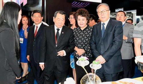 6月14日,2017中国·天津华侨华人创业发展洽谈会在天津梅江会展中心开幕。图为中国国务院侨办主任裘援平、天津市委书记李鸿忠、天津市市长王东峰、中国侨商投资企业协会会长谢国民参观世界侨商项目与商品博览会。 中新社记者 佟郁 摄