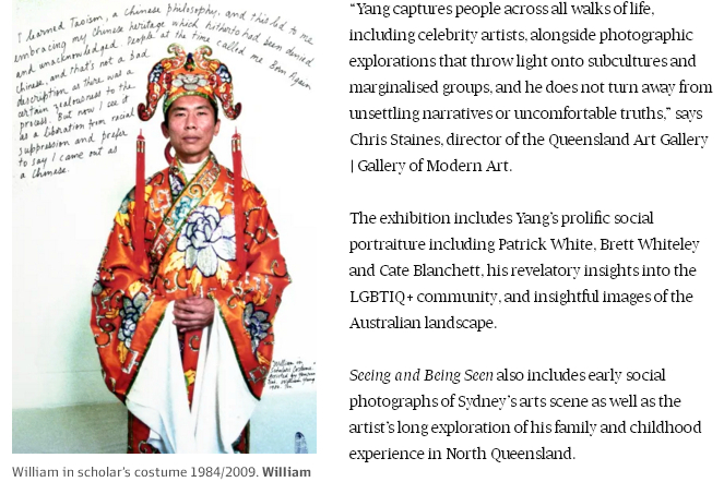 华裔摄影师杨威廉举办摄影展澳华裔表演艺术家、摄影师杨威廉(WilliamYang)近日正在昆州展出《看见和被看见》(SeeingandBeingSeen)摄影展,探索了他作为华裔身份的