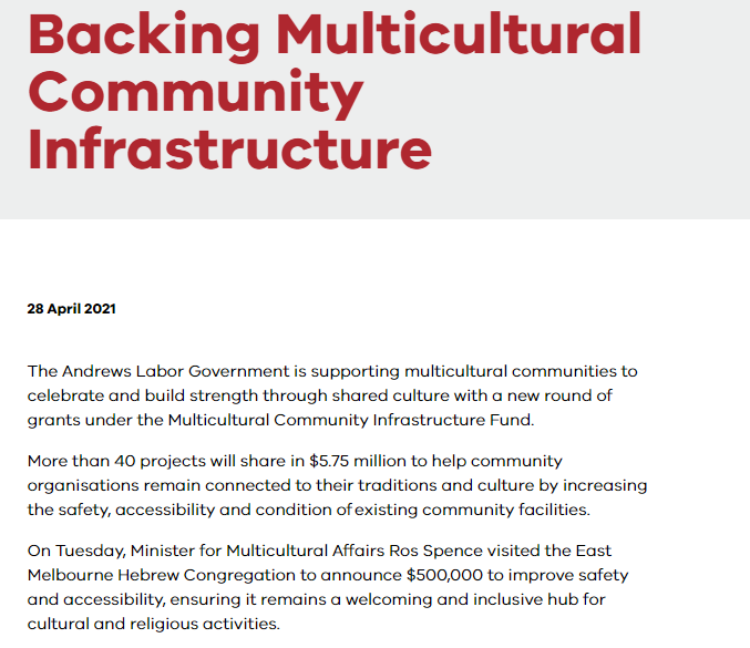 维州政府近日通过发放新一轮的拨款支持多元文化社区的基建建设,将由超过40个项目共享575万元的资金。维州政府官网28日报道,这些资金来自维州多元文化社区基建基金