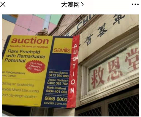 拥有超过100年历史的墨尔本卡尔顿区(Carlton)华人教堂拥有超过100年历史的墨尔本卡尔顿区(Carlton)华人教堂本周二(6月29日)公开拍卖。历史学家和华人社区成员对此