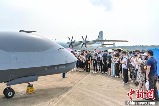 9月29日,广东省珠海市,港澳青少年观摩团参观无侦-7无人机。当日,由港澳青少年组成的观摩团来到珠海国际航展馆参观第十三届中国航展。
