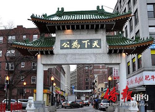 哈里森街口刻着孙文“天下为公”的牌坊。(美国《侨报》)(美国《侨报》)据美国《侨报》报道,美国波士顿唐人街是纽英伦地区唯一的唐人街,北美第四大唐人街。占地五