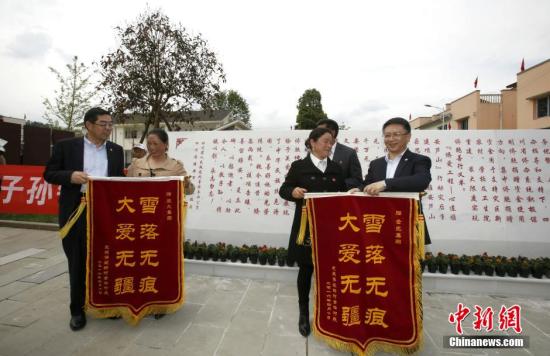 嘉宾为“思延侨爱新村”揭碑。 刘忠俊 摄中新网雅安4月10日电(记者徐杨祎)“感恩侨爱—四川雅安芦山地震灾后重建巡礼”10日在“思延侨爱新村”举行主题活动。国