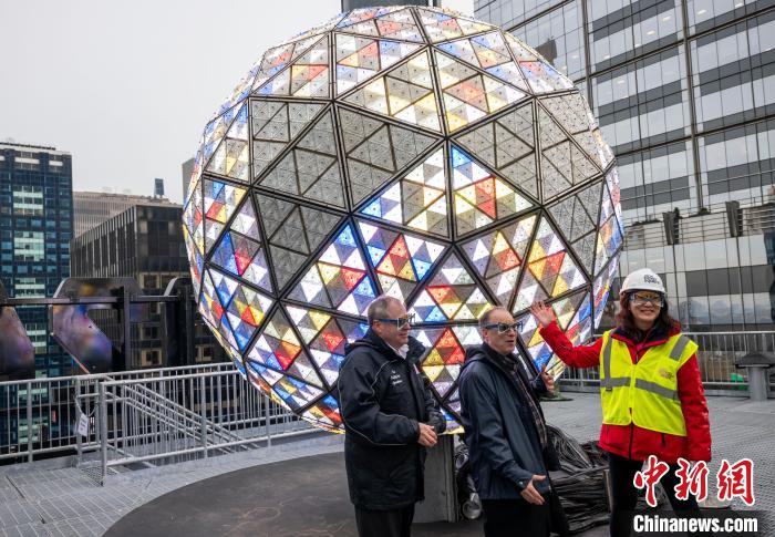 中新社纽约12月27日电(记者王帆)纽约时报广场新年倒计时水晶球27日调试完毕后亮相。用于跨年夜庆祝活动的水晶球此次采用了全新设计的灯光图案向历史致敬。“今年