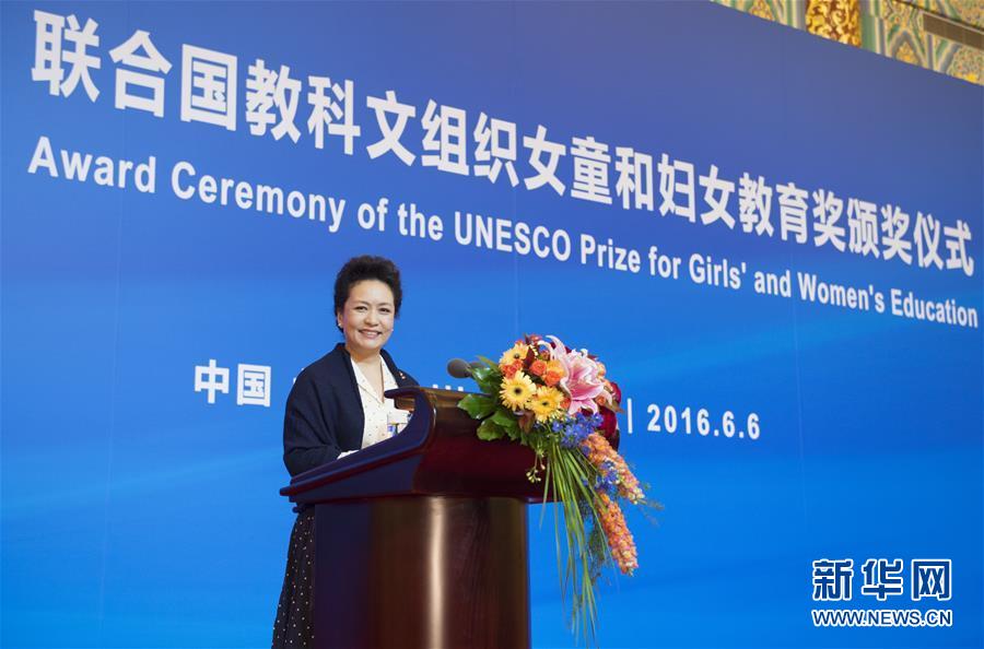6月6日,首届联合国教科文组织女童和妇女教育奖颁奖仪式在北京人民大会堂举行。中国国家主席习近平夫人、联合国教科文组织促进女童和妇女教育特使彭丽媛出席颁奖仪