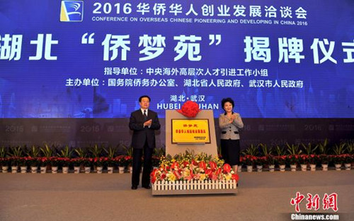 6月23日,第十六届华侨华人创业发展洽谈会在武汉开幕。图为中国国务院侨办主任裘援平与湖北省省长王国生共同为湖北“侨梦苑”揭牌。中新社记者张畅摄中新社武汉6月
