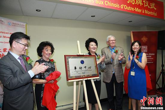 加拿大蒙特利尔的满城华人服务中心被中国国务院侨务办公室授予了“华助中心”。在当地时间22日举行的揭牌仪式上,到访蒙特利尔的国侨办主任裘援平(右三)为其授牌。