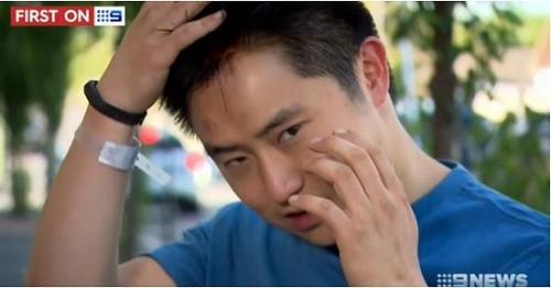 陈基思展示受伤的头部。3月1日电据新西兰天维网援引当地媒体报道,当地时间2月27日凌晨1点左右,在澳大利亚墨尔本东北区发生了一起恶性劫车案件,一名华裔男子驾驶的