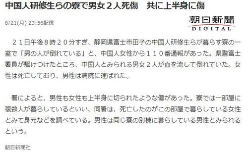 中国侨网8月22日电据日媒报道,当地时间21日20时20分过后,日本静冈县富士市田子的两名中国研修生在一间宿舍中疑似被砍伤,男性倒在血泊中,女性拨打了报警电话,当县