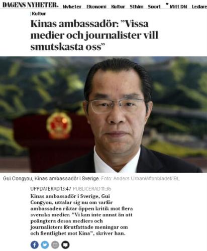 据中国驻瑞典大使馆网站消息,中国驻瑞典大使桂从友17日在瑞典《每日新闻报》上刊文表示,瑞典一些媒体和记者对中国抱有偏见、成见和敌意,希望他们遵循新闻从业者的