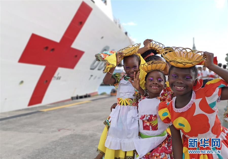 10月22日,在安提瓜和巴布达首都圣约翰,当地小朋友身穿传统服装欢迎中国海军和平方舟医院船首次到访。执行“和谐使命-2018”任务的中国海军和平这是中国海军舰艇首