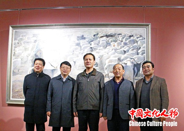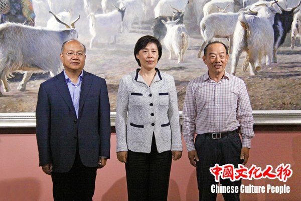 中国文联副主席李前光,河北省文联主席解晓勇与韩玉臣在《牧羊女》作品前合影