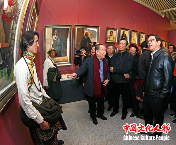 韩玉臣向中国艺术研究院院长连辑,中国美术家协会分党组书记、驻会副主席、秘书长徐里,中央美术学院院长、中国美术家协会副主席范迪安等领导及艺术家嘉宾介绍西藏题材油画作品及作品中的人物原型