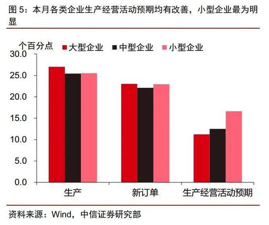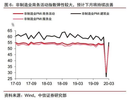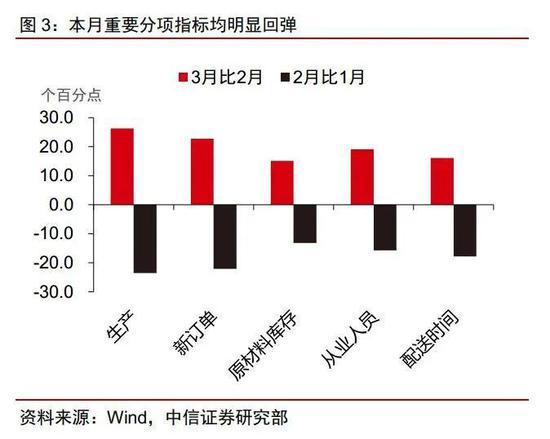 不同企业景气程度均有所修复,大型企业复苏最为明显。在《2020年2月中采PMI数据点评——疫情短期冲击明显,预计3月数据将有改善》(20200229)中,我们判断大型企业复工复产将快于中小企业,有望成为经济平稳运行的“压舱石”,本月大、中、小型企业PMI分别为52.6%、51.5%和50.9%。3月以来,各类政策相继出台,3月27日政治局会议指出“要抓紧研究提出积极应对的一揽子宏观政策措施”,在近期相关政策的呵护下,大中小企业的生产经营活动预期指数分别较上月环比改善11.2、12.5和16.6个百分点至55.5%、52.5%和54.0%,但由于中小企业复工进程中面临的问题较大型企业更为复杂,因此预计会有更为针对性的政策支持,总体而言,制造业企业生产经营有望在年内回到合理水平。