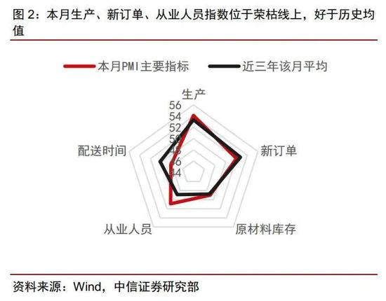 PMI为环比指标,本月数据表明约有一半以上企业景气程度较前月改善。根据《采购经理调查统计报表制度》,制造业PMI由新订单(计算权重为30%)、生产(25%)、从业人员(20%)、供应商配送时间(15%)和原材料库存(10%)5个分项指数加权计算而成,分类指数采用扩散指数方法计算,即调查问卷中答“增加”的百分比与答“持平”的百分比一半之和,因此直观来看,本月PMI表明约有52%的企业景气程度较前月有所改善。本月PMI的改善反映了自3月以来,企业复工复产明显加快,在调查的企业中,本月大中型企业(不含小型企业)复工率为96.6%,较前月上升了17.7个百分点。由于环比指标未能考虑基数、季节等因素,因此本月PMI数据的大幅改善并不意味着其他以同比方式呈现的经济指标也大幅改善。目前国内防疫已取得阶段性成效,但海外疫情仍在蔓延,制造业企业生产、销售受对外贸易影响较大,PMI能否持续位于扩张区间,仍需观察。