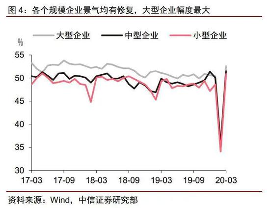 本月PMI数据表明约有一半以上制造业企业景气程度较前月有所改善,大型企业尤为明显,我们认为主要与相关政策陆续出台,企业加速复工复产有关。境外疫情呈加速扩散蔓延态势,恐将严重冲击我国对外贸易,进而拖累制造业修复进程,PMI能否持续位于扩张区间仍需观察。