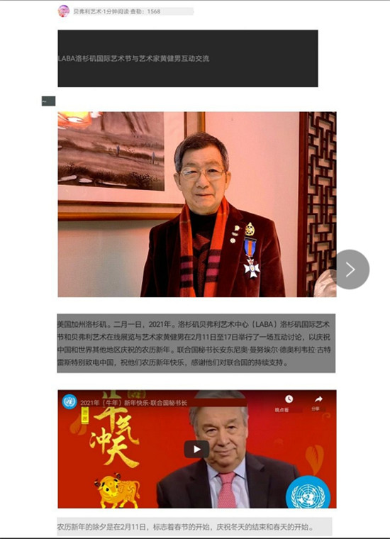 据了解,文章内容是国际艺术节组委会共同主席、联合国科切拉山谷分会创办人、圣乔治皇家学会主席凯伦·坎特雷尔公主,共同主席、美国著名电视主持人周正视频连线中国艺术家黄建南所进行的互动。其中,还发表了一组特别的视频和文字。这视频和文字,来自联合国秘书长古特雷斯,他在热诚地向中国拜年。