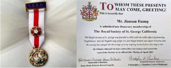 文章说,黄建南从圣乔治皇家学会(RSSG)获得荣誉会员,并参加了在加利福尼亚州比佛利山庄为爱丁堡公爵菲利普亲王举行的RSSG致敬活动(1921年6月10日至2021年4月9日)。