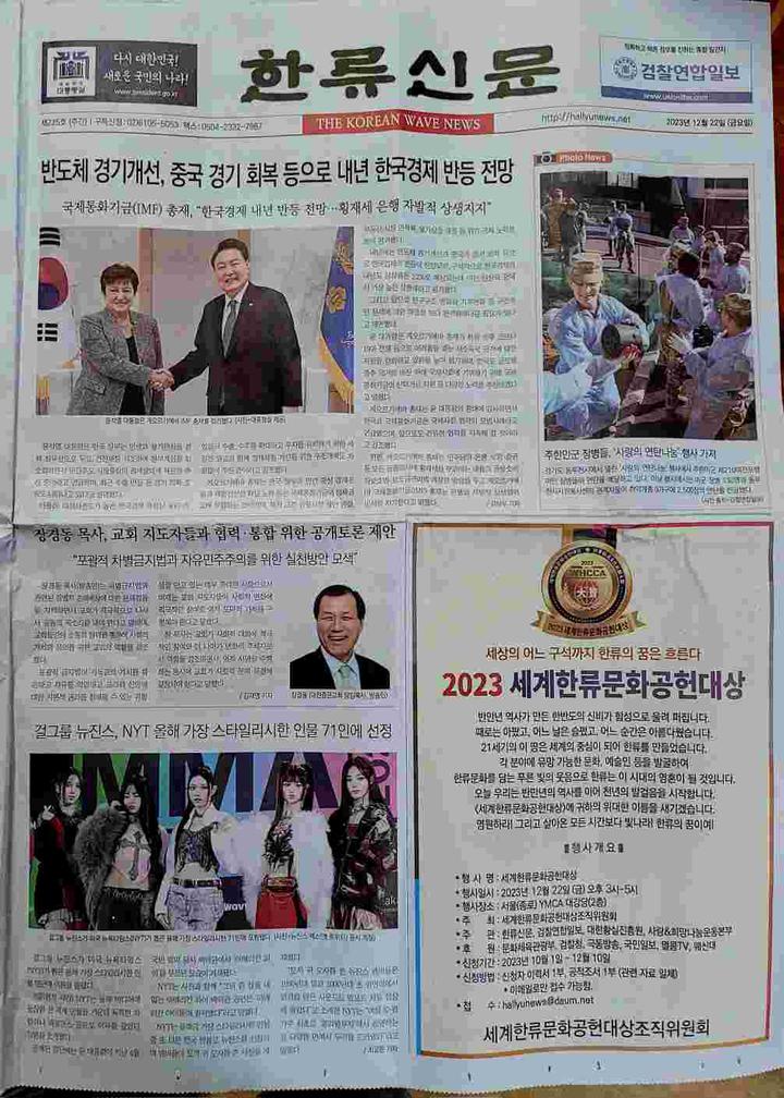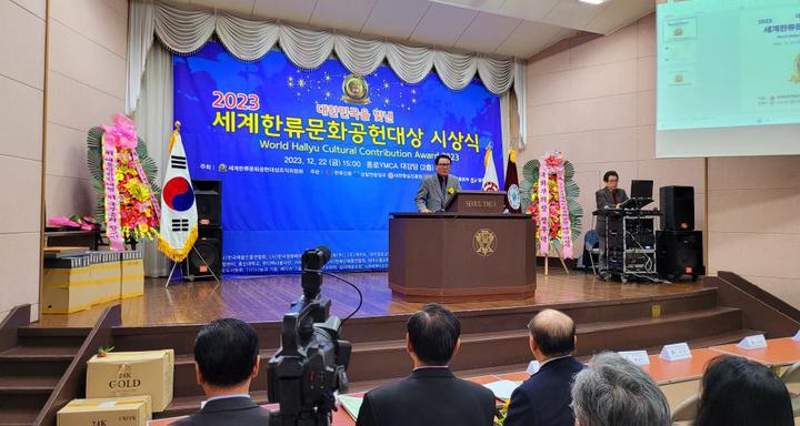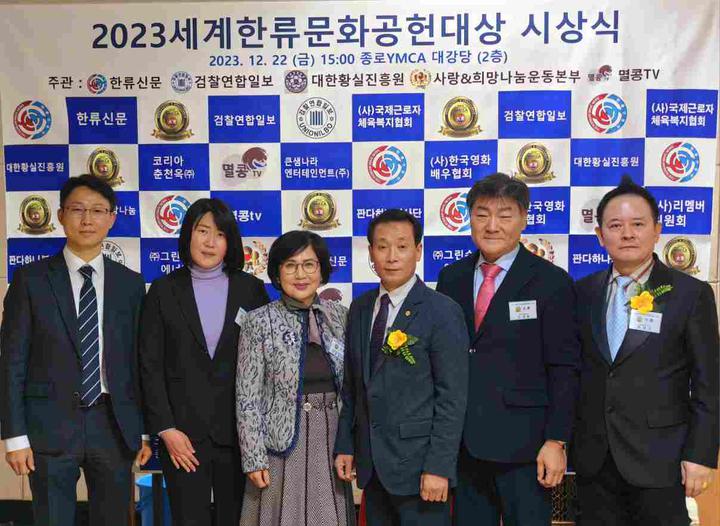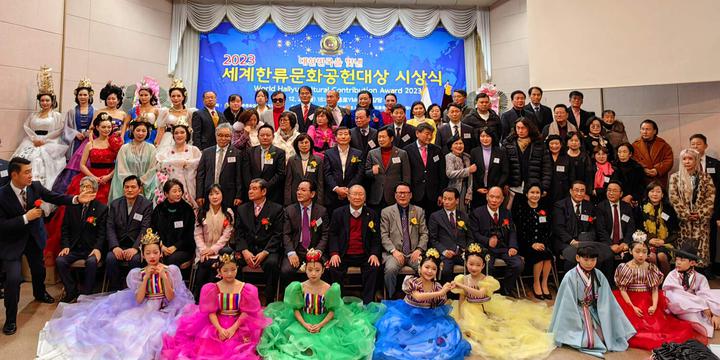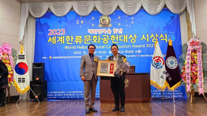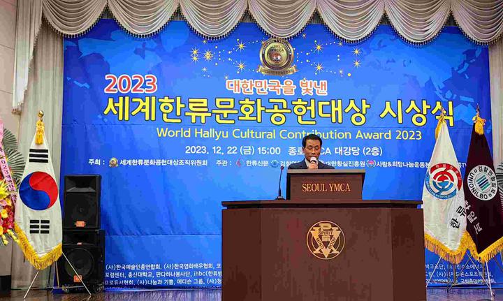 韩国新华报讯(记者 李茂娥 摄影报道)由世界韩流文化功勋大奖组织委员会主办,韩流新闻、检察联合日报、大韩皇室振兴院、博爱&希望运动本部等联合承办,韩国新闻放送总联合会、(社)韩国电影演员协会、(社)韩国艺术人总联合会、总神大学、新韩大学、(社)青少年文化院、警察联合新闻等联合后援赞助的,“2023年展示大韩民国的世界韩流文化功勋大奖”颁奖典礼,于12月22日在首尔市中心中路YMCA大礼堂内隆重举行,在韩中国同胞媒体代表、韩中新闻记者协会会长兼韩国新华报社社长曹明权博士榜上有名。也是目前唯一获得此项殊荣的在韩中国同胞代表。