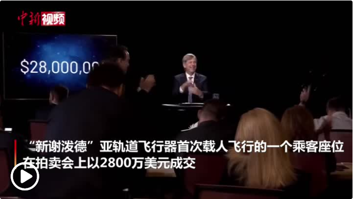 据美国中文网报道,当地时间12日,美国富豪杰夫·贝佐斯旗下太空公司蓝色起源的“新谢泼德”亚轨道飞行器首次载人飞行的一个乘客座位,在拍卖会上以2800万美元成交。