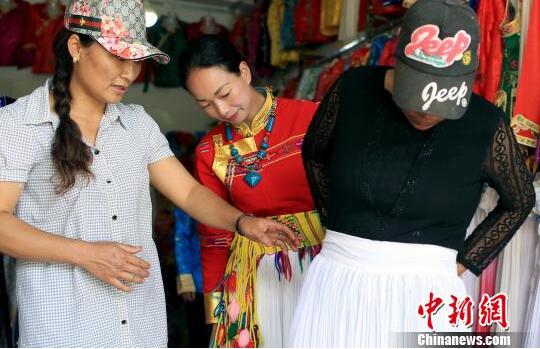 摩梭妇女正在试穿百褶裙。 王磊 摄中新网盐源10月2日电题:(我这五年)四川摩梭姑娘创业路:传统摩梭服饰变身时尚潮品作者刘婷王鹏在风光旖旎的泸沽湖畔,头戴鲜花