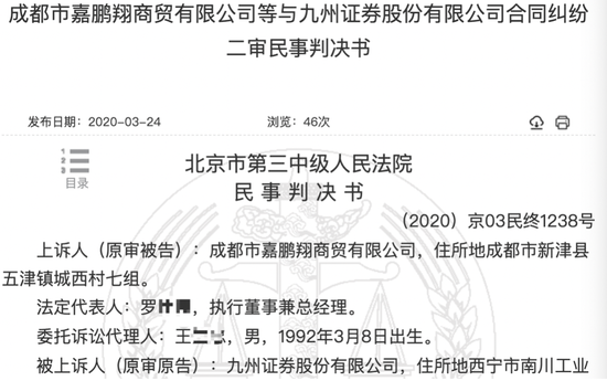 新浪财经讯近日,裁判文书网公布了一则判决书,九州证券财务顾问客户嘉鹏翔公司以用款人非本人而是关联公司天翔环境(1.800,0.00,0.00%)(维权)为由拒付所欠服务费用