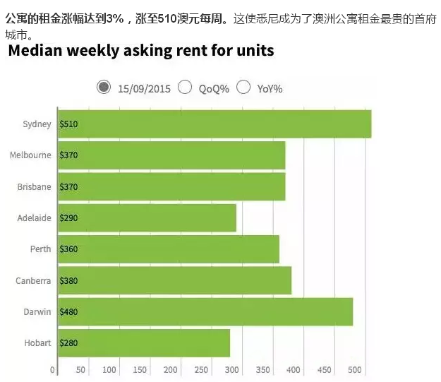 公寓的租金涨幅达到3%,涨至510澳元每周。这使悉尼成为了澳洲公寓租金最贵的首府城市。