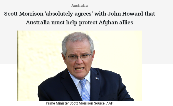 前总理霍华德(John Howard)8日接受专访时提出,澳洲政府应当承担起道德上的责任,帮助那些曾经在阿富汗协助过澳洲执行任务的阿富汗人。对此,总理莫里森(Scott Morrison)9日表示,他“完全赞同”霍华德的说法。