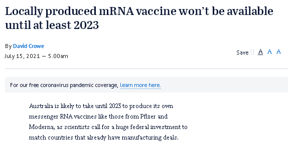 据悉,在和主要的全球伙伴签署本地mRNA疫苗工厂的问题上,澳洲已经落后于亚太地区的其他国家。新加坡、中国和韩国在今年5月就已经签署了本土生产疫苗的协议。