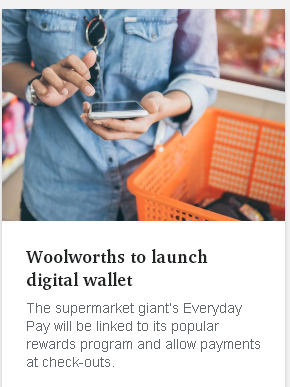 澳洲超市巨头Woolworths近日正在创建一个数字钱包并与其广受欢迎的Everyday Rewards忠诚度计划相连,以此来扩展其在高增长金融科技领域的产品套件。