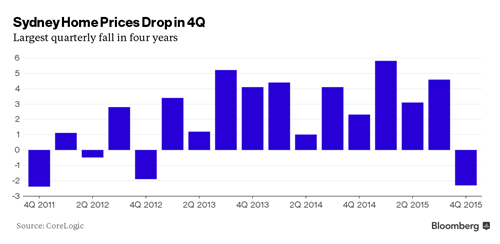据报道,经过一年的强劲增长后,悉尼房价的下跌拖累了2015年最后一个月的全国平均房价,使其停滞不前。