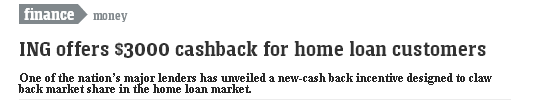 ING集团近日推出了一项新的3000元返现激励措施,以期吸引其他银行的客户将他们的住房贷款转移过来。ING在贷款市场中本来排名第五位,去年8月ING被竞争对手麦格理银