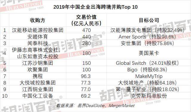 2019年中国企业出海跨境并购Top 10
