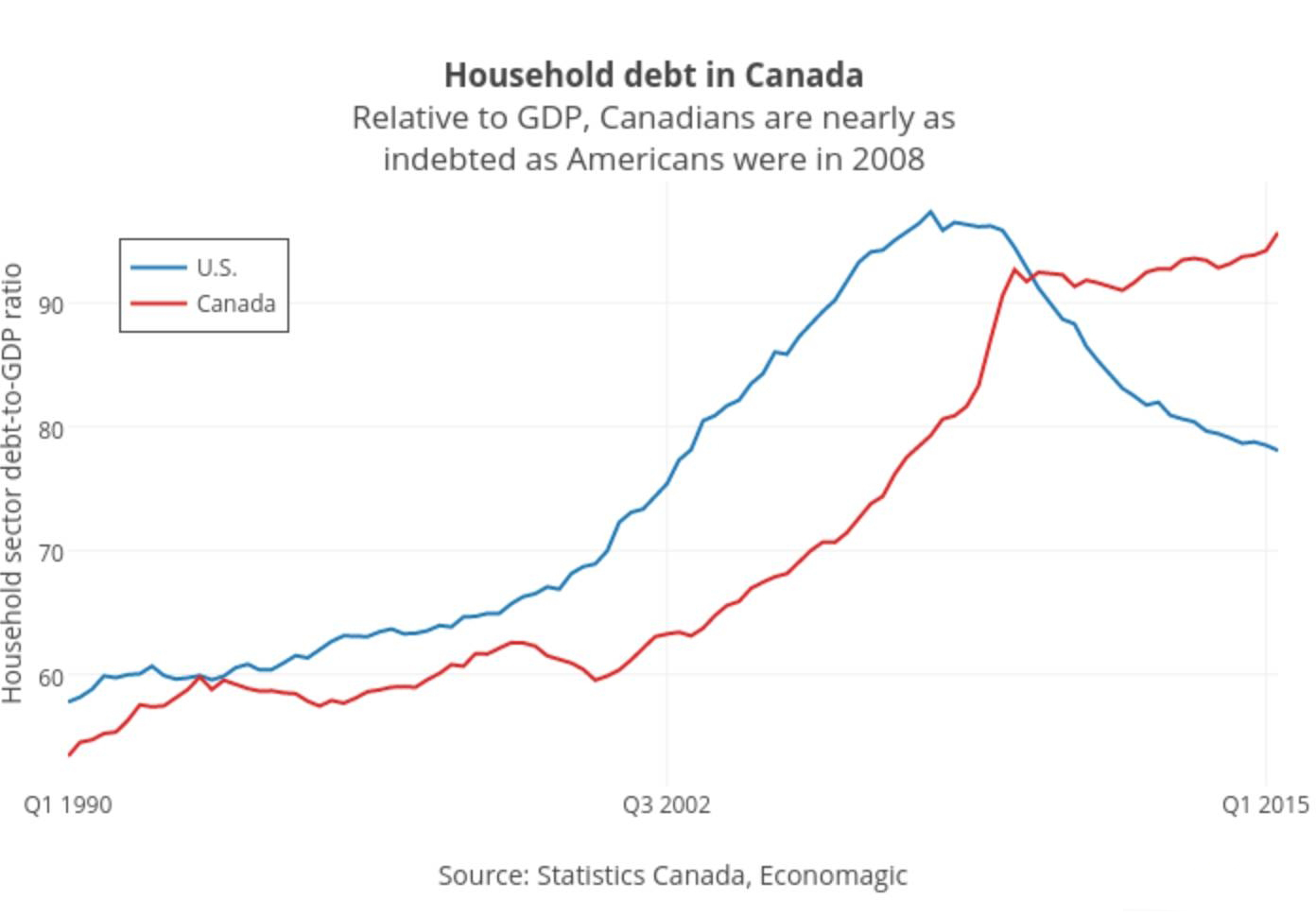 上图不难看出,自美国2008年地产崩盘后,美国的房地产市场经历了一场残酷的洗礼,经济逐步恢复,民间负债水平不断下降,再加上美元汇率的反弹,美国民众的日子比起加拿大要轻松不少。