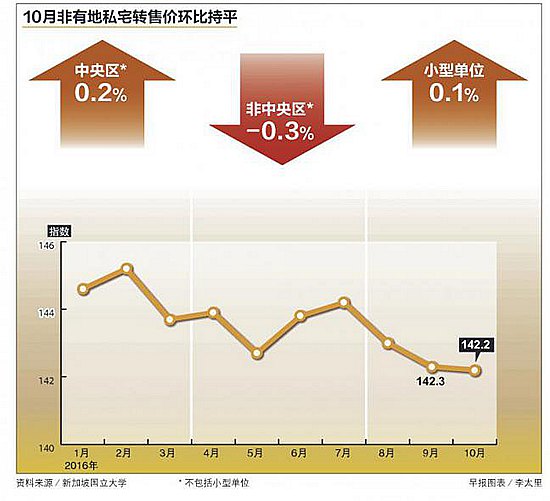 本地非有地私宅转售价连续两个月下滑后,10月环比持平。分析师说,经济前景不佳,买家仍保持谨慎态度,预料会促使私宅转售价继续下滑。新加坡国立大学昨日发布的房地