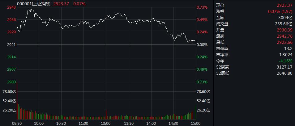 截至收盘,沪指涨0.07%,报2923.37点,成交金额3004亿元;深成指跌0.04%,报11108.36点,成交金额4774亿元;创业板指跌0.10%,报2143.12点,成交金额1531亿元。