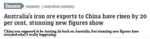 ABS数据显示,澳洲对中国的总出口量增长了16%,这几乎全部受到铁矿石贸易(提升20亿元)和肉类出口(数量增加28%)的驱动。